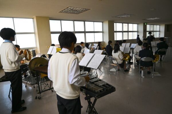 まずは飛翔館アリーナにて、全体説明を行いました。飛翔館の2階では、吹奏楽部によるウェルカム演奏を行い、皆様をお出迎えをさせていただきました。