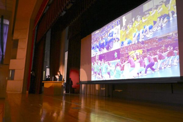 まずは本校飛翔館アリーナにて、全体説明を行いました。はじめに学校長の三浦先生から挨拶があり、次に現役の東海学園高校生から、東海学園高校についてさまざまな視点から魅力が語られました。