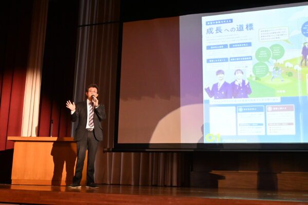 次に、教務副部長の白石先生から学校行事や学習などの学校生活全般について紹介がありました。
